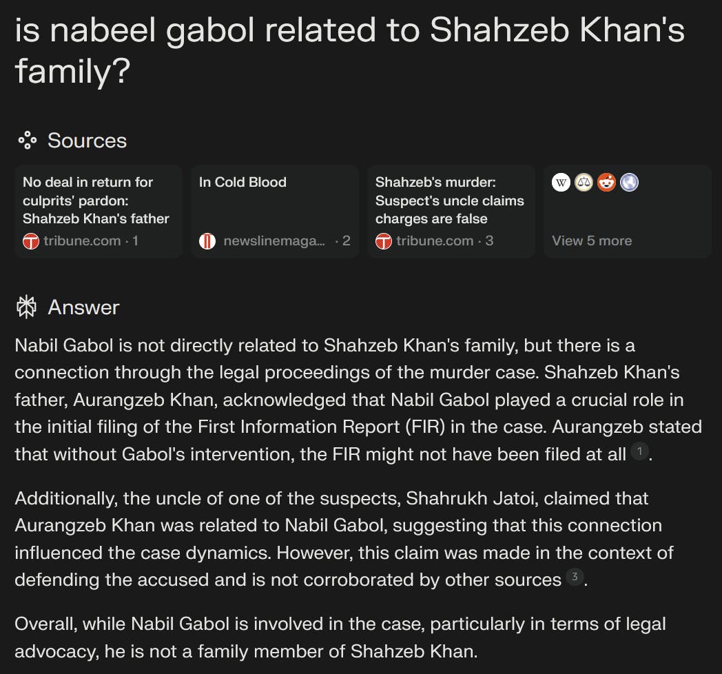 I was instantly skeptical of the Reddit users’ claim, so decided to dig up some more information, and to Perplexity’s credit, it accurately corroborated that the politician in question was not related to the victim’s family.
